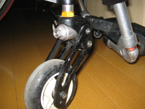 キャスターには大小さまざまな種類があります。あまり小さいと、ちょっとしたくぼみにキャスターがはまり動けなくなります。大きすぎるとかかとにキャスターがあたり回転することが出来ません。現在の主流はサスペンション入りのキャスターですが、足に伝わるガタガタを抑えてくれるので痙性の抑制にもなります。
